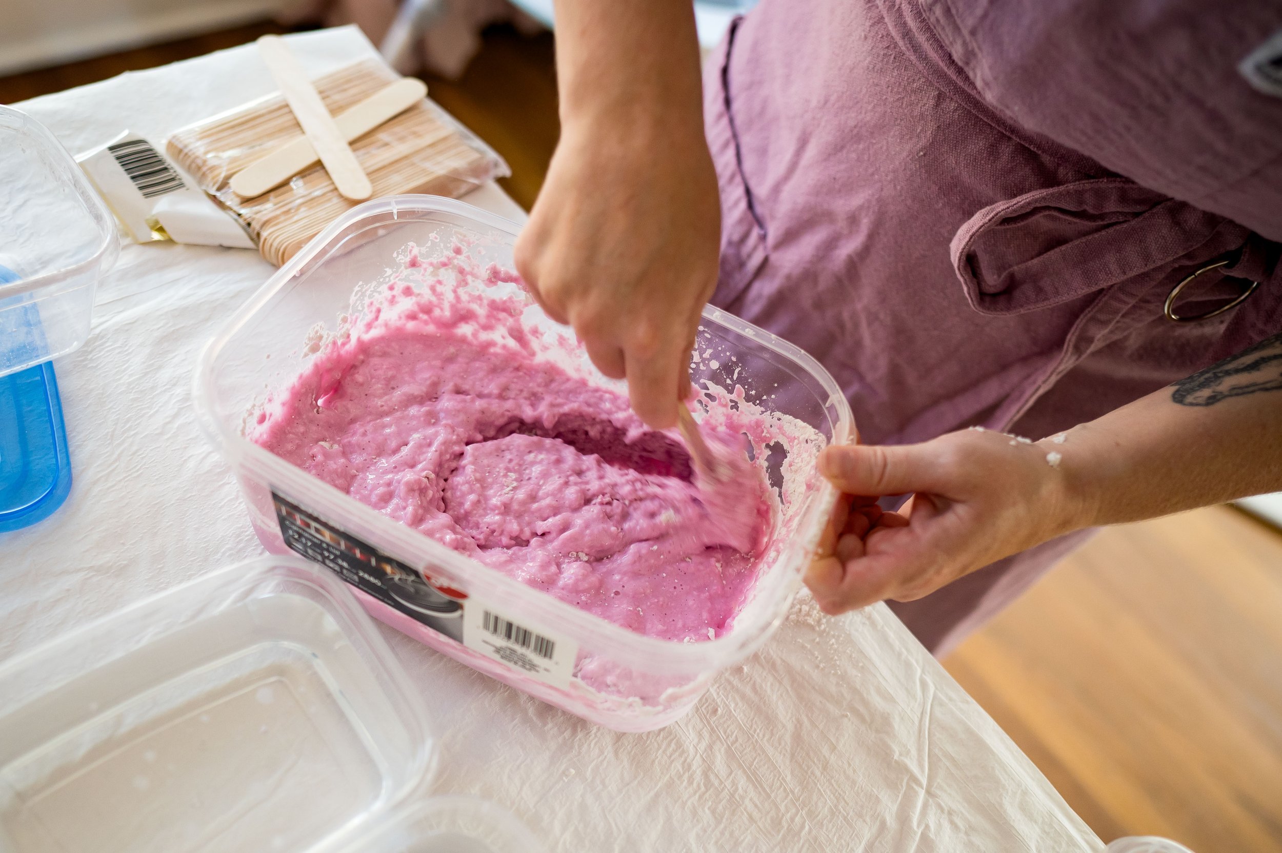 I will prepare a cozy area for us to cast in and for me to begin mixing up a special concoction of alginate and water. Alginate is hypo-allergenic and safe to use on the most delicate skin – it is even safe in the mouth as it is most commonly used in dentistry for taking teeth impressions. The alginate is nice and warm, has a consistency similar to thick custard, and takes less than a minute to set.