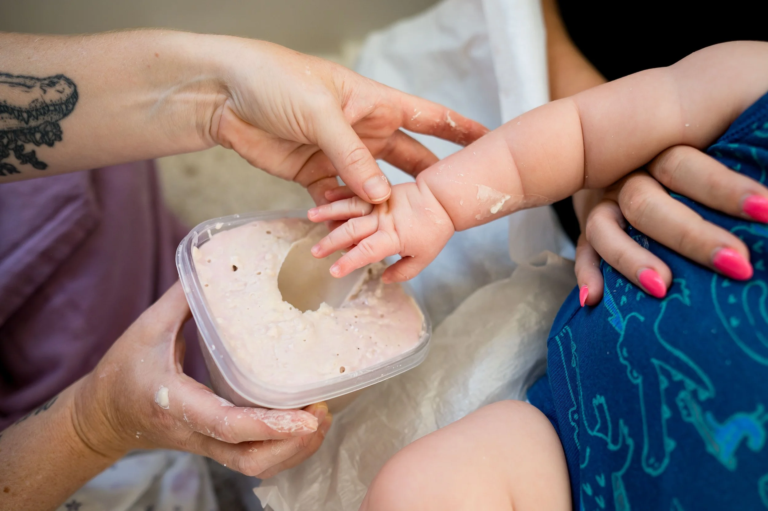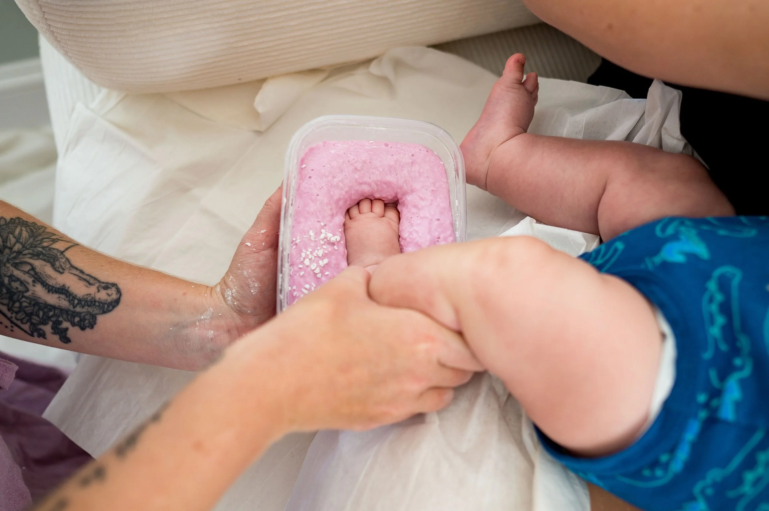 Your little one might be awake or asleep. Either is fine! I will gently moisturize their hands and feet and place them into the alginate mixture to set - which takes up to a minute. The mixture is warm, and sometimes they don’t even notice I’m doing it. I’ll take as many molds needed - it’s all part of the experience!